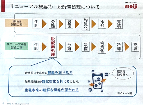 これまでの生クリームの製法が変わり、殺菌前に「脱酸素処理」を行うことで、酸素を取り除き、殺菌時の酸化劣化を抑え、生乳本来の風味を保つ製法になりました。